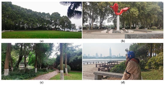 Xuanwu Park in Nanjing was selected as the experimental site. It is the largest comprehensive park in central Nanjing, covering a total area of 5.13 km2. It is a well-equipped scenic spot with a diverse landscapes and rich biodiversity. Setting the research in large city parks is beneficial. Urban parks, as inclusive, open spaces, can include a variety of greenspace types with varying characteristics while reducing experimental error due to site location, climate, elevation, and inconvenient transportation of equipment and people. The authors selected four natural environments of similar size within the park (see Figure 1 and Table 1): Grassplot (site A), Square (site B), Forest (site C), and Lakeside (site D). Site A is a large lawn with an open, gentle topography where visitors can relax. Site B is a sculpture square with ample seating and prominent markers. Site C is a dense forest with more shadiness and a complex plant hierarchy. Site D is a ribbon corridor consisting of a chain of wooden boardwalks and a few lakefront platforms with wide views of the distant skyline. The experiment was conducted from 11 October to 5 November 2021. With bad weather (heavy rain and wind) and non-working days excluded, there were a total of 16 measured days. The Supplementary Materials (Table S1) provide specific time and location information for the measurement.
