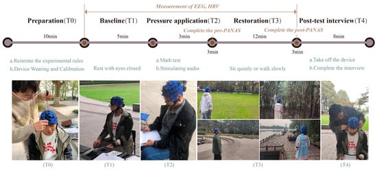 Before the experiment, all participants completed a personal basic information questionnaire, including age and gender, via WeChat and email. Each participant was informed that they could withdraw if they experienced any discomfort during the experiment. Upon arrival at the site, participants will be guided through the day’s experimental site by our staff and informed of the site boundaries. Figure 2 shows the five experimental steps: preparation (T0), baseline (T1), pressure application (T2), restoration (T3), and post-test interview (T4), over approximately 44 min. Physiological measurements were taken during baseline (T1), pressure application (T2), and restoration (T3). Psychological measurements were taken before and after the restoration stage.