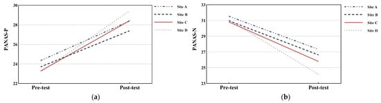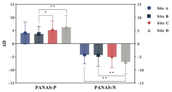 PANAS-POS: Sig. of ΔDP (Greenhouse–Geisser) = 0.002 < 0.05, F (3.00, 36.00) = 5.84, Partial η2 = 0.33. A significant difference was detected in the change in positive mood measured before and after the four sites. It was concluded that the Square significantly differed from the Forest and Lakeside spaces for increased positive affect. The change in the positive affect scores of Site B was significantly less than Site C (t = −3.04, p < 0.05) and Site D (t = −3.71, p < 0.01).