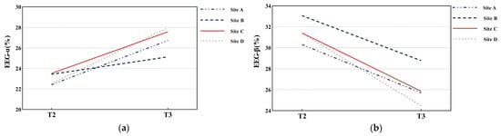 Two-way repeated-measures ANOVAs were performed for each EEG-α, EEG-β, and LF/HF at baseline (T1), stress (T2), and restoration (T3) stages for the four sites. Table S3 in the Supplementary Materials presents the results. EEG-α (F = 340.27, p < 0.001 ***, Partial η2 = 0.98), EEG-β (F = 53.15, p < 0.001 ***, Partial η2 = 0.76), and LF/HF (F = 140.54, p < 0.001 ***, Partial η2 = 0.88) were highly significant for the time effect. However, neither EEG-α (F = 2.12, p = 0.13, Partial η2 = 0.52), EEG-β (F = 1.62, p = 0.175, Partial η2 = 0.09), nor LF/HF (F = 0.21, p = 0.943, Partial η2 = 0.01) were significant in terms of interaction effects, and further pairwise comparisons are needed. Further pairwise comparisons were made between the baseline (T1), stress (T2), and restoration stages (T3). The results showed extremely significant differences between the baseline stage (T1) and the pressure application (T2) for all data. This result indicates that applying pressure had a marked intervention effect. The pressure application (T2) was compared to the restoration stage (T3), showing significant differences in EEG for all sites except B. Restoration-α was distinctly greater than Stress-α, and Restoration-β was distinctly less than Stress-β for sites A, C, and D, as shown in Table 4. Figure 4 shows the EEG trends from the pressure application to restoration. Only the LF/HF of Site A changed significantly during the pressure application (T2) compared to restoration (T3), while no significant differences were seen for the remaining sites.