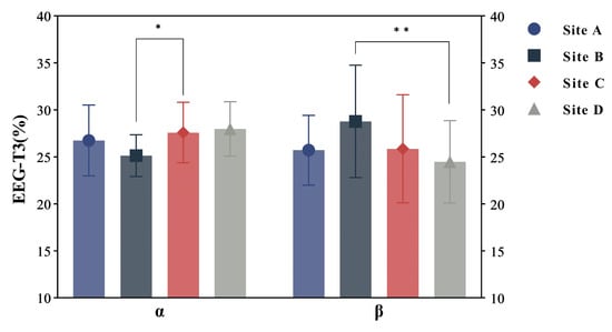 Differences in EEG between the experimental sites at restoration (T3). * p < 0.05, ** p < 0.01.