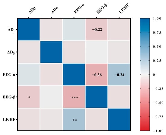 Pearson correlation was used to analyze the associations between self-reported and objective measures of recovery effects. The results showed a significant (p < 0.05) inverse relationship between EEG-β and the amount of positive mood change during the restoration stage, with a strength of r = −0.223 *. This is consistent with our hypothesis. No significant correlations were detected between PANAS indicators for other physiological indicators. In addition, we found a significant inverse correlation (p < 0.01) between EEG-α and heart rate variability index LF/HF in the restoration stage, with a correlation strength of r = −0.342 **. As in previous studies, a highly significant negative correlation was found between EEG-α and EEG-β. However, we found a non-significant association between the amount of positive and negative affect change. Figure 7 shows the correlation coefficients among restorative indicators.