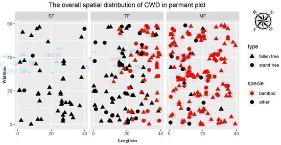 In this study, the spatial distribution of CWD with different decay classes varied with different forests. In SF, the CWD of each decay class was distributed randomly as a whole (Figure 6a,d). For a stable community without human disturbance, the formation of CWD is likely the result of natural thinning of forests, abnormal weather, and physiological death [26]. Self-thinning and physiological death are stable and long processes, and the resulting CWD distribution pattern is closely related to living trees. Only abnormal weather likely results in large CWDs in a short time [56]. The CWD of decay classes IV–V in TF (Figure 6e,g,h) and the CWD of decay classes I–III in MF (Figure 6c) mainly showed an aggregated distribution. The fallen bamboos in TF showed strong aggregation distribution (Figure 7f). These results suggest trees in TF and MF were more susceptible to forming fallen trees, especially in TF which had more young expanded bamboos, with immature root growth and development, shallow distribution, and poor anchorage ability. Meanwhile, this is also a result of more severe intraspecific and interspecific competition in the forest due to the expansion of Moso bamboo. Moso bamboo expansion may have a negative effect; therefore, measures such as digging shoots and cutting bamboo could control its expansion in protected areas to favor the conservation of the surrounding forests.