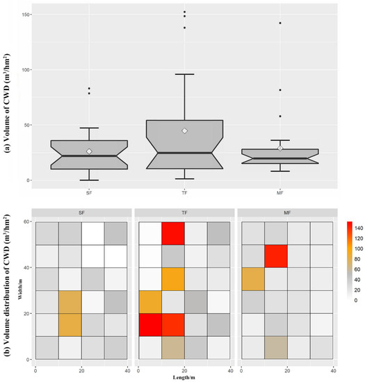 Volume of coarse woody debris in three forests (a) and volume distribution of 24 small quadrats (10 m × 10 m) in each forest (b).