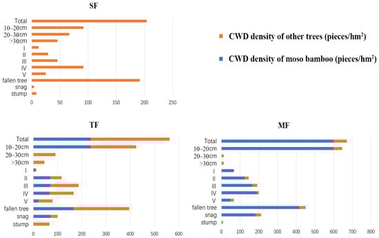 Basic statistical characteristics for coarse woody debris in three forests (SF, TF, and MF). The horizontal coordinate is the density distribution of CWD (pieces/hm2). The vertical ordinate is data type which represent the total, the diameter class (10 ≤ D < 20 cm, 20 ≤ D < 30 cm, D ≥ 30 cm), decay class (I–V), and the existing type (fallen tree, snag, and stump) of CWD, respectively.