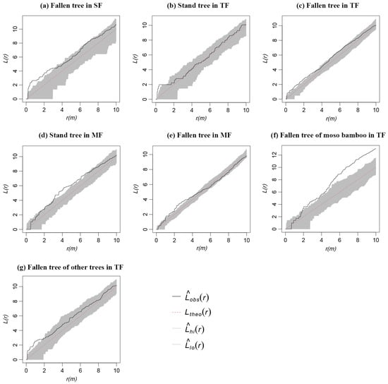 The small diameter CWD in SF and TF showed aggregation characteristics at all scales (Figure 5a,d), while the CWD of medium diameter and large diameter mainly showed a random distribution (Figure 5b,c,e,f). The small diameter CWD in MF showed an aggregated distribution on the scale of 1–5 m, and the aggregated distribution became a random distribution with the increase in scale (Figure 5g). Due to the very low number of medium diameter and large diameter CWD, no separate analysis for these trees could be conducted.
