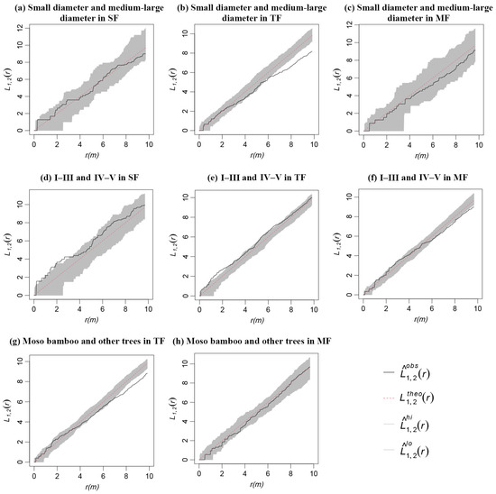 The Moso bamboo and other trees in TF were independent within the scale of 0–7 m. However, a negative spatial correlation existed when the scale was greater than 7 m (Figure 8g). The Moso bamboo and other trees in MF were independent of any spatial scales (Figure 8h).