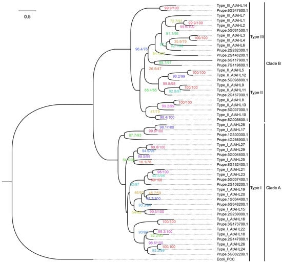 Phylogenetic analysis of the peach PpAHLs. This tree was generated using IQ-tree with the maximum likelihood (ML) method. The 10,000 bootstrap replicates and 1000 SH-aLRT random addition replicates were applied to prepare this consensus to represent the phylogenetic relationships.