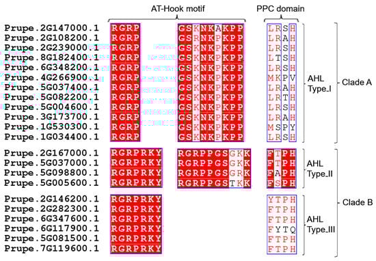 A total of 22 PpAHL proteins were identified in the peach genome that contained both an AT-hook motif and a PPC domain (Table 1). The number of PpAHLs in peach is lower than that in Arabidopsis (29) [40], poplar (37) [5], maize (37) [41], soybean (63) [17], and carrot (47) [42], and higher than those in castor (16) [2], tung tree (19) [2], and grape (19) [6], suggesting AHLs in different plant genomes have different degrees of expansion. To determine the phylogenetic relationship between AHLs, we constructed a ML tree using the full-length proteins which divided these AHLs into two clades, Clade-A and Clade-B according to the topology of the tree and bootstrap values. Clade-A contains 12 PpAHLs and Clade-B consists of 10 PpAHLs (Figure 1). These results are very similar to those reported previously [5,40]. For example, Li et al. (2022) analyzed the AHLs of 20 plants and also divided them into two clades [2]. We further performed multiple-sequence alignment of PpAHLs to examine two characteristic domains, AT-hook and PPC (Figure 2), and found that these PpAHL sequences could be further classified into Type_I, Type_II, and Type_III. Of the 22 PpAHLs, 12 (54.5%) belong to Type_I, 4 (18.2%) correspond to Type_II, and 6 (27.3%) are Type_III. The PpAHLs from Type_I belong to Clade-A while the PpAHLs from Type_II and Type_III belong to Clade-B. The proportions of three different types of PpAHLs in two different clades in the peach genome are basically similar to those in other plants [2,6,40]. For example, although Clade-B contains members of Type_II and Type_III, which has fewer PpAHL members, Clade-A (Type_I) contains the most PpAHL members. These results imply that the evolutionary diversity of AHLs is well-conserved in both monocot and eudicot plants.