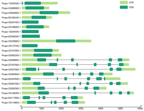 Exon–intron structure of PpAHLs in peach. The untranslated regions (UTRs), introns, and exons are indicated by green rectangles, thin lines, and blue rectangles, respectively.