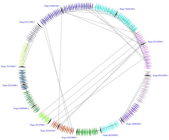 Gene duplication events may involve the expansion of gene members in peach [21,22,25]. Here, we constructed the gene duplication analysis of PpAHLs to reveal the evolutionary process. The PpAHLs were used as anchor sites to detect duplication events in the regions where they reside. The flanking genes containing the anchor site PpAHL were aligned, and if there were three or more pairs that were microsynteny, they were considered to be derived from a large-scale duplication event [53,54].