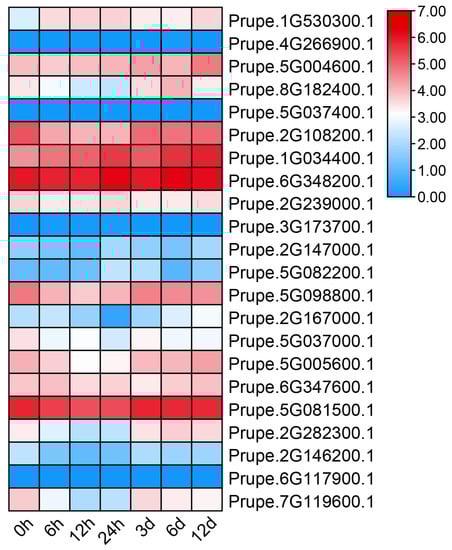 We collected peach cultivar ‘Xia Huanjin’ fruit samples on 20 June (125 days) corresponding to the ripening stage in 2022 after flowering (DAF) from 20-year- old pear trees grown on a farm in Hefei, Anhui, China. The peach fruits were sprayed with 25% polyethylene glycerol-6000 (PEG) to induce drought stress. The sampled fruits were collected at 0 and 12 h (h) after treatment and immediately frozen in liquid nitrogen for later use. Total RNA Rapid Extraction Kit (Magen, Guangzhou, China) was used to extract the total RNA for all obtained samples. PrimeScript™ RT Reagent Kit with gDNA Eraser (Takara, Dalian, China) was used to synthesize the first-strand cDNA. SYBR® Premix Ex Taq™ II (Takara Bio Inc., Kusatsu City, Japan) was used to carry out the qRT-PCR, based on the manufacturer’s instructions. The PCR program consisted of 40 cycles at 95 °C for 10 s and 60 °C for 30 s, separated by a 95 °C cycle for 1 min. The PpTEF2 was used as an internal control for normalization [39]. Primers (Table S1) were designed using a primer-designing tool (https://www.ncbi.nlm.nih.gov/tools/primer-blast/, accessed on 15 May 2023).