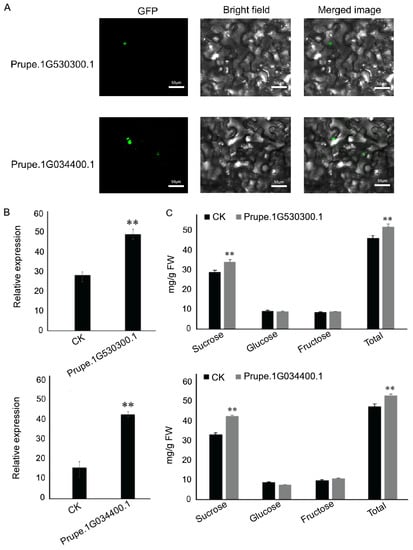 Functional analysis of Prupe.1G530300.1 and Prupe.1G034400.1. (A) Analysis of subcellular localization of AHL genes; (B) expression analysis of Prupe.1G530300.1 and Prupe.1G034400.1 in peach fruits; (C) functional analysis of Prupe.1G530300.1 and Prupe.1G034400.1 via their transient overexpression in peach fruits. The bars on the sugar content chart represent the standard error (SE) of the measurements, ** p < 0.01.
