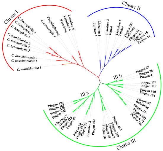 Unrooted neighbor-joining (NJ) dendrogram based on Nei’s genetic distance of 57 hazelnut accessions. All accessions were divided into three genetic lineages: Cluster I (red) included 11 accessions of four wild species and 2 accessions of Ping’ou hybrid hazelnut; Cluster II (blue) included 12 accessions of Ping’ou hybrid hazelnut; Cluster Ⅲ (green) included 31 hybrid accessions of Ping’ou hybrid hazelnut. Cluster Ⅲ was divided into two sub-clusters Ⅲ a and Ⅲ b.