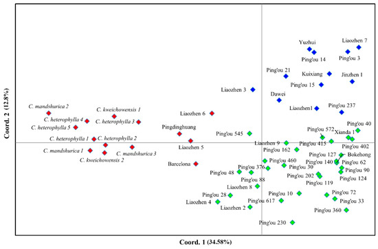PCoA was performed to check the displacement of the accessions and to further confirm the clustering pattern obtained from the dendrogram (Figure 2). The first two PCs explained 47.38% of the cumulative variance among accessions, with PC1 accounting for 34.58% of the variance and PC2 for an additional 12.8%. The two-dimensional projection defined by the first two PCs of 57 hazelnut accessions also showed a similar clustering pattern to that of the NJ dendrogram. All accessions were grouped into three parts according to their genetic distance along the two axes. Apparently, the wild genotypes showed a tendency to separate from the hybrid hazelnut. Additionally, the hybrid accessions were separated into two main groups, corresponding to two clusters (II and Ⅲ) in the phylogenetic tree. Information on genetic relationships among breeding accessions is essential for plant breeders to efficiently improve species.