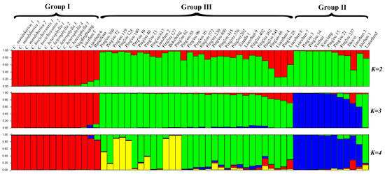 Population stratification and genetic admixture of 57 hazelnut accessions, as inferred by STRUCTURE, with three, four, and five populations (K = 2, K = 3, and K = 4). A single vertical line represents a single accession, and different colors indicate different groups. Segments of each vertical line represent the extent of admixture in an individual.