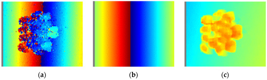 For the simulated PolInSAR datasets, we first use the master and slave images to generate the interferogram as in Figure 2a, from which we can see the obvious flatland effect. And the forest height inversion is seriously affected by the flat earth effect, so it needs to remove the flat earth effect, which is shown in Figure 2b. The interferometric phase with the removed flat earth effect is shown in Figure 2c. Then, a 7 × 7 window is used for the complex coherence estimation.