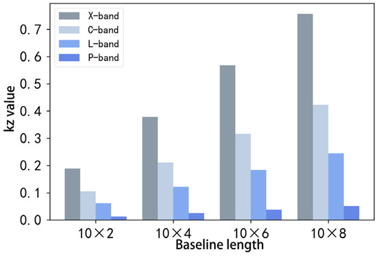 According to Equation (9), we know that the spatial baseline length is related to the vertical effective wave number , then the relationship between them is briefly addressed here. is a key parameter in the RVoG model, which reflects the sensitivity of the height to interferometric observations and is crucial to the inversion of forest height. The effect of on the forest height inversion is that when the forest height is fixed, during a range of , the larger is, the more serious the decoherence caused by the scattering of vegetation; when fixed, in a range of forest height, the higher the forest height, the more the volume scattering decoherence [6]. Moreover, the relationship is affected by forest structure through different extinction values. In this study, the extinction value is fixed at each band according to previous studies. Figure 3 shows the histograms of values of the simulated data at each band with different baselines.