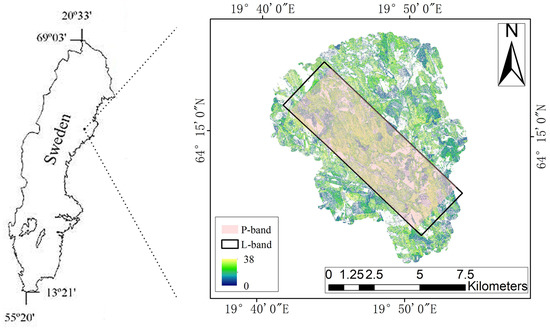 The airborne PolInSAR data used in this study were collected by DLR (German Aerospace Center) and Swedish Defence Research Agency (FOI) using an airborne ESAR system in the Krycklan region of Sweden in October 2008 in BioSAR2008 projects. Three L–band PolInSAR aerial flight datasets and three P–band PolInSAR aerial flight datasets were selected in this study. The data incidence angles of the two bands vary from about 25° to 55°, where the P–band data have an azimuthal sampling of 0.74 m and a range sampling of 1.50 m, and the L–band data have an azimuthal sampling of 0.47 m and a range sampling of 1.50 m. The coverage of the L– and P–band SAR datasets is shown in Figure 4. All the datasets were acquired in full polarization mode. Detailed information about the imaging configuration parameters is shown in Table 2.
