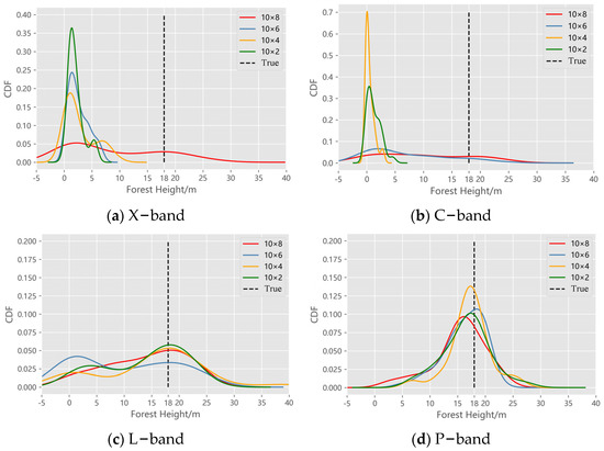 In order to analyze the distribution characteristics of the inversed results, Cumulative Distribution Function (CDF) plots were generated, as shown in Figure 8. Each plot is drawn from 50 randomly selected points in the forest area from the inversed results using the above-mentioned four bands with different baseline combinations. In Figure 9, the simulated data generated for these experiments set the mean forest height as 18 m, and the related values are shown as black dash lines in the sub-figures. It can be seen that the results in the long wavelength, like the L– and P–bands, are accumulated at 18 m, while the estimated results using short wavelengths, like the X– and C–bands, have peaks between 0 m and 5 m, which revealed the obvious underestimation of forest height using the X– and C–bands PolInSAR datasets. At the X–band, only the results using a baseline combination of 10 × 8 m show a wider dynamic range of estimated results, while for the C–band, both of the baseline combinations of 10 × 6 m and 10 × 8 m have a wide dynamic range of the estimated values. In the L–band, the distributions of the estimated values in various baseline combinations are similar, with two peaks between 0–5 m and 15–25 m, and most of the values fluctuated around 18 m, but the distribution of the results is more discrete, and the dynamic range is larger when compared with the performance of P–band. In the P–band, the results of each baseline combination show a highly aggregated distribution near the true value, especially the baseline combination of 10 × 4 m. The 10 × 4 m baseline combination achieved the best performance in this study, with the highest frequency distribution close to the true value.