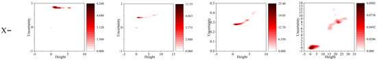 In this study, Absolute error (, Equation (14)), Predictive accuracy (Acc, Equation (15)), and Standard deviation (Sd) (, Equation (16)) are used to quantify the uncertainty of the inversed results [37,38].