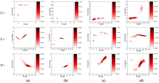 Two–dimensional histogram between uncertainties of estimated forest height and the forest height estimated using RVoG models. (a) 10 × 2 m; (b) 10 × 4 m; (c) 10 × 6 m; (d) 10 × 8 m.