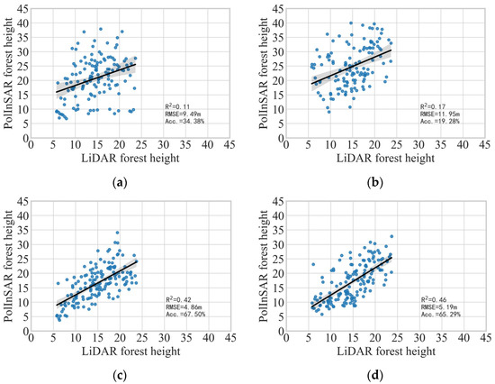 Forest height inversion results. (a) 10 × 2 m; (b) 10 × 4 m; (c) 10 × 6 m; (d) 10 × 8 m.