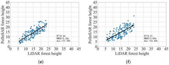 For the performance of the L–band PolInSAR datasets, the results acquired using a 6 m spatial baseline of the L–band showed the worst performance in the three selected baselines. The estimated results showed large dispersion with R2 = 0.11, RMSE = 9.49 m, and Acc. = 34.38%. When the baseline increases to 12 m in Figure 12c, the inversed results obviously improve with R2 of 0.42, RMSE of 4.86 m, and Acc. of 67.50%. When the spatial baseline increases to 18 m, the R2 reaches a maximum of 0.64, the RMSE reaches a minimum of 3.32 m, and the Acc. has the highest value of 77.78%. The results acquired at the L–band revealed that with the increase in baseline, the accuracy of inversion is increased. Meanwhile, the distribution of the scatter plots in (e) showed reduced overestimation and underestimation errors when compared with (c), while the overestimation and underestimation errors in (c) are also better than that in (a). The performance of the P–band shows a similar trend to the L–band; the longer baseline dataset performed better than the shorter baseline for the forest height inversion. The best performance was acquired at the baseline of 24 m with R2 of 0.51, RMSE of 3.82 m, and Acc. of 74.44%. The worst performance was acquired with a baseline of 8 m with R2 = 0.17, RMSE = 11.95 m, and Acc. = 19.28%. Not that the P–band with a 24 m baseline performed better than the L–band with a 12 m baseline but worse than the L–band with an 18 m baseline. However, both the L– and P–bands showed better performance when the baseline was higher than 8 m. The Acc. values range from 65% to 80%. The results also revealed the estimated accuracy depends on the wavelength and baselines. It is crucial to choose a suitable spatial baseline when using the RVoG model for forest height estimation. This also agrees with [27,37,38].