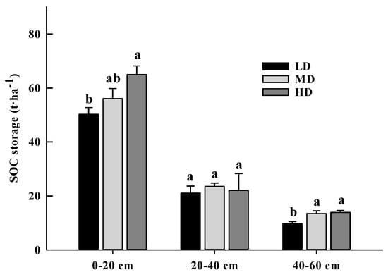 The SOC storage of larch plantations with different stand density. Bars represent the means with standard error in error bar (n = 3), different letters represent significant differences among stand densities in the same layer (p < 0.05). LD, MD and HD represented low density, middle density and high density.