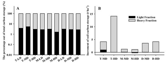 The C stored in soil can be separated as light fraction SOC and heavy fraction SOC according to its density []. The light fraction SOC is known as the residual of plants and animals, which has a high C concentration but low proportion in soils; while the heavy fraction SOC is known as refractory humus, which has a low C concentration but high proportion. This leads to the different implications of light fraction SOC and heavy fraction SOC on soil C sequestration and balance. Studies have shown that C stored in soil heavy fraction and light fraction are altered by different stand density [,,]. However, it remains unclear whether the variation of total SOC storage that changed with stand density is mainly due to the variation of light fraction or the heavy fraction. Having better knowledge of it could help to expound the capability of soil C sequestration in the forests of different stand density.