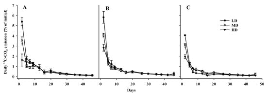 Daily emission rate of cellulose derived CO2 (14C-CO2) from soils of larch plantations with different stand density in the 0–20 cm layer (A), 20–40 cm layer (B), and 40–60 cm layer (C). The error bar presents the standard error (n = 3; p < 0.05). LD, MD and HD represented low density, middle density and high density.