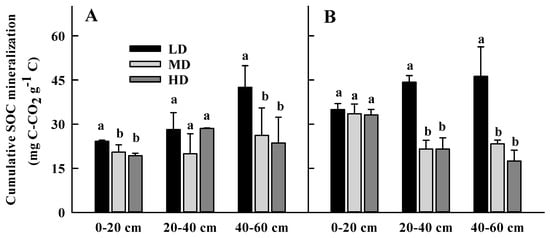 Cumulative SOC derived CO2 emission rate in control (A) and cellulose addition (B) of larch plantations with different stand density. Bars represent the means with standard error in the error bar (n = 3), different letters represent significant differences among stand densities in the same layer (p < 0.05). LD, MD and HD represented low density, middle density and high density.