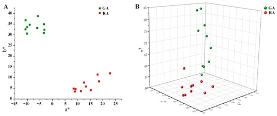 L*, a*, and b* paraments of calyxes GA and RA. (A) a* and b* paraments of calyxes GA and RA. (B) Three-dimensional diagram of L*, a*, and b* paraments.