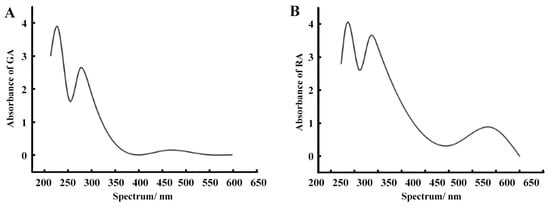 Ultraviolet-visible spectrum analysis of pigment components. (A) Absorbance of GA calyxes. (B) Absorbance of RA calyxes.