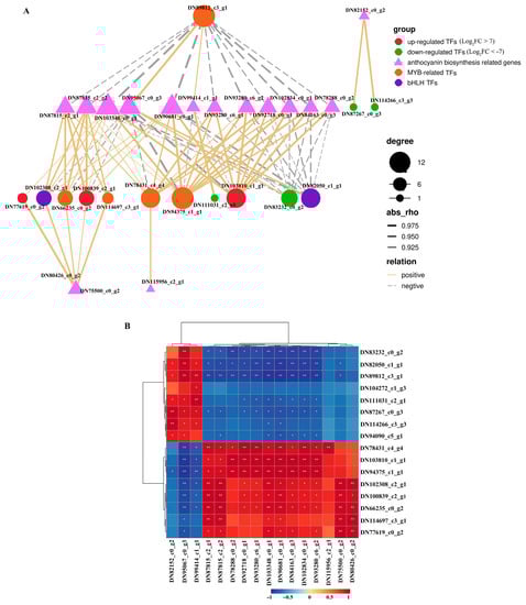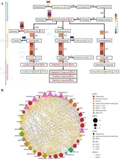 Analysis of TFs, DEGs, and DAMs in relation to anthocyanin biosynthesis. (A) The pathway map containing DAMs and DEGs in relation to anthocyanin biosynthesis. (B) The co-expression analysis of TFs, DEGs, and DAMs in relation to anthocyanin biosynthesis. R was more than 0.9 and less than −0.9 with p < 0.05.