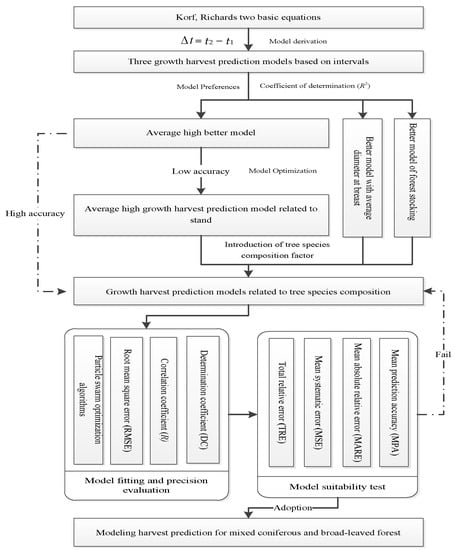 Fujian Province, which has the highest forest coverage rate in China, was selected as the study area, and mixed coniferous and broad-leaved forests of different ages were chosen as the study objects. With such a study area as the basis, the issues of stand age, site quality, and tree species composition in mixed coniferous and broad-leaved forests could be simultaneously addressed []. Two theoretical growth equations, i.e., Korf and Richards, were used to build the growth and harvest prediction models for the mixed coniferous and broad-leaved forests. The interval period (referred to as interval, = t2 − t1,) rather than the stand age was considered as an independent variable []. Site quality grade and the tree species composition coefficient (TSCC) were introduced to optimize the models. Using these models, the growth and dynamic changes in the mixed coniferous and broad-leaved forests at different ages were revealed, which solved the problems of diverse species composition, varying ages of uneven-aged forests, and complex site environments. The models are conducive to improving the modern management of forest resources, and the specific technical route of the models is shown in Figure 1.