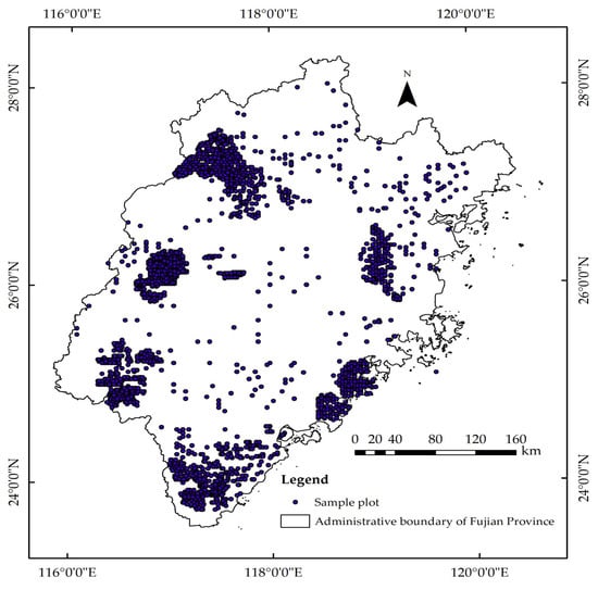 The study area is located in southeastern China (23°33′–28°20′ N, 115°50′–120°40′ E). This area has a subtropical monsoon climate and is warm and humid, with an average annual rainfall of 1400–2000 mm, which makes it one of the most rainfall-rich provinces in China. It is rich in forest resources, and the forest coverage is 66.80%. The forest area is divided into the subtropical broad-leaved evergreen forest area in the central and western regions and the subtropical monsoonal forest area in the eastern region. It is a research hotspot for scholars specializing in forestry and ecology and an important place for forestry production practices (Figure 2).
