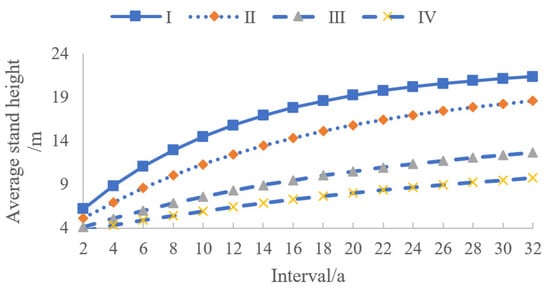 The three base models are not as effective as D and M in describing the growth regularity of coniferous and broad-leaved trees, and related studies have shown that the average stand height is significantly correlated with the site quality of stand. Therefore, the site quality grade, which is commonly used to evaluate site quality in Chinese forestry production practices, was introduced as a dummy variable into model (1) to construct the average stand height growth and harvest prediction model, in which the site quality grade was used as a dummy variable and the interval period was used as an independent variable.