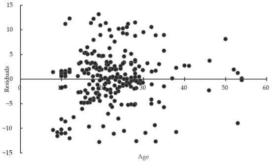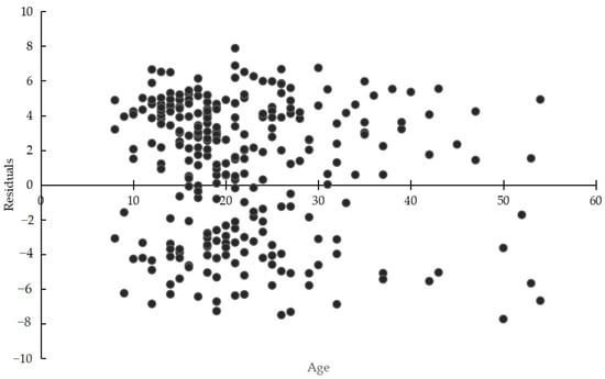 The applicability test was conducted on 30% of the sample data that did not participate in the modeling, a residual plot was drawn, as shown in Figure 5 and Figure 6, and residuals were compared against predicted values of the average stand height growth and stand volume, as shown in Figure A2 and Figure A3. After calculation, the applicability evaluation value of the average DBH growth and harvest prediction model was 3.14 of TRE, 4.01 of MSE, 0.99 of MPE, and 3.82 of MARE. Each value was within the range of ±5%. The applicability value of the stand volume growth and harvest prediction model was −6.24 of TRE, 5.97 of MSE, 3.26 of MPE, and 7.19 for MARE, all within the range of ±10%. It can been seen from Figure 5 and Figure 6 that the residual points are randomly distributed and show no tendency in the direction of the abscissa, and the distribution of residual points exhibits no heterogeneity. That is to say, the average DBH and the stand volume growth and harvest prediction models not only fit the average DBH and the stand volume of mixed coniferous and broad-leaved forests at different ages well, but also eliminate the homoscedasticity and heteroscedasticity of the models. Therefore, the average DBH and stand volume growth and harvest prediction models developed in this study can be used for forecasting the average DBH and stand volume in mixed coniferous and broad-leaved forests in forestry production practice.