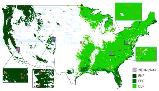 We chose the contiguous U.S. (CONUS) as the study area because of the abundant field data collected by NEON. As shown in Figure 1, the eastern region of the CONUS is dominated by deciduous broad forests (DBFs), while the western region is characterized by evergreen needle forests (ENFs). The total ENF, EBF, and DBF areas across the CONUS are 6.67 × 105 km2, 1.68 × 105 km2, and 2.11 × 106 km2, respectively. In evergreen forests, the dominant species include Abies balsamea, Abies lasiocarpa, Juniperus virginiana, Picea glauca, Picea mariana, Pinus contorta, Pseudotsuga menziesii, Tsuga canadensis, etc. On the other hand, Acer rubrum, Betula alleghaniensis, Carya tomentosa, Fraxinus americana, Liquidambar styraciflua, Liriodendron tulipifera, Populus tremuloides, Quercus alba, and Ulmus americana, among others, dominate deciduous forests [39].