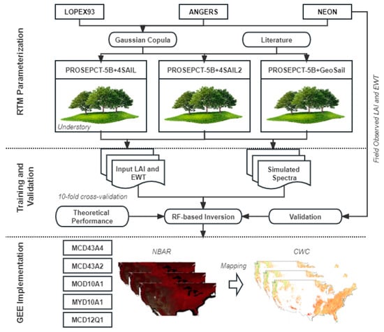 Thirdly, the simulated reflectance of the grass canopy was used instead of bare soil. This improvement can make the simulation of the forest more realistic [28]. However, the ground cover of CONUS forests is usually dominated by herbaceous and shrub layers [77]. Further study on the influence of forest underlayer on the inversion of CWC is needed.