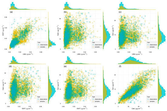 Constrained random samples of tree LMA, EWT, Cab, and Car based on field observations using Gaussian copula: (a) LMA vs. EWT; (b) LMA vs. Cab; (c) LMA vs. Car; (d) EWT vs. Cab; (e) EWT vs. Car; (f) Cab vs. Car.
