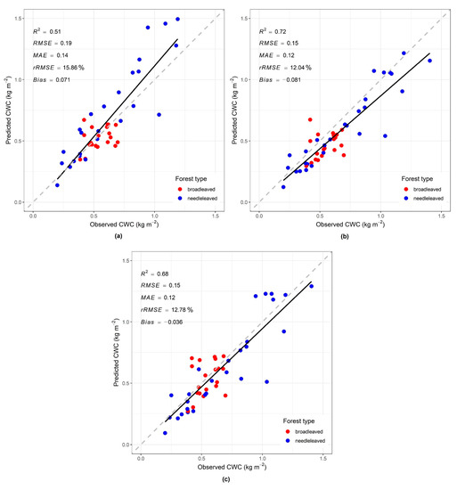 In this study, we estimated the forest CWC at a coarse spatial resolution. To study the species-specific characterization of CWC, hyperspectral, LiDAR, terahertz technology, and high-resolution images from unmanned aerial vehicles (cm to m level), Sentinel-2 (10 m), and Landsat 8–9 (30 m) could be used [61,78].