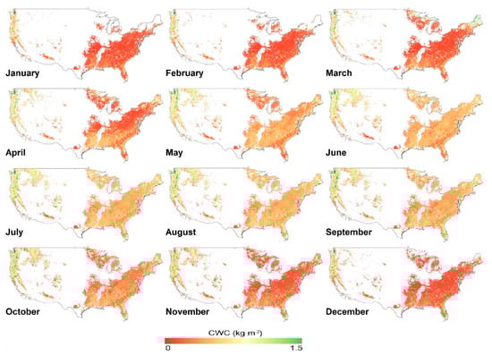 Retrieval models were implemented in GEE using MODIS products to monitor spatiotemporal variations in forest CWC across the CONUS. The monthly mean forest CWC values from 2017 to 2021 were then generated (Figure 6, Figures S2 and S3).