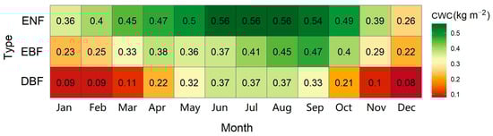 Spatially, CWC exhibited variations between different forest types. Lower CWC values were observed in the DBF located in the eastern part of the CONUS, whereas higher CWC values were generally found in the ENF in the western region. Additionally, CWC dynamics varied with the month. As Figure 7 shows, throughout the year, forest CWC showed an increasing trend from January to August, followed by a decreasing trend until December. The DBF exhibited more significant seasonal variation compared with the ENF and the EBF.
