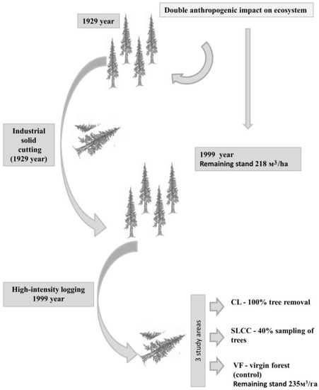 The scheme of the double anthropogenic impact (continuous logging: controlling cutting areas, conventional logging areas and under virgin forest) on the studied ecosystem and the formation of the studied sites.