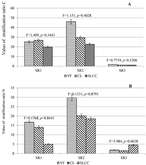 Coefficient of stratification of carbon content (A) and plant nutrition elements (B,C) in soils affected by logging (controlling cutting areas (SLCC), conventional logging areas (CL) and virgin forest areas as control (VF)). The vertical bars represent standard deviations. The values of F and p for soils are obtained on the basis of ANOVA.