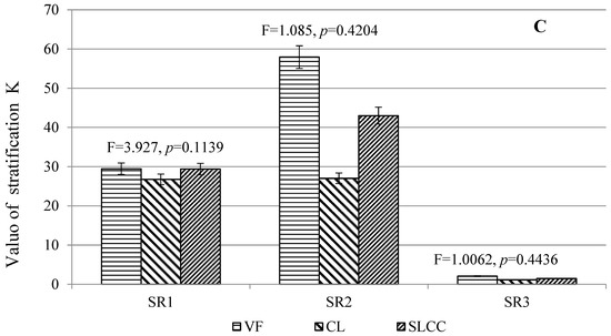 The change in this indicator for all soils was wide for SR1 and SR2, whereas for SR3 this indicator was narrower. The two opposite values for the SR indicate the accumulation of nutrients in the upper horizons of soils, which is associated with the climatic features of the territory [36,38]. At the same time, it was found that for potassium, there was the largest range of changes in SR1 and SR2; for nitrogen and carbon it was narrower. For SR3, the largest ranges of changes for this indicator were noted for carbon and potassium; for nitrogen the range was smaller. The general trend of higher values for the SR measurement range for potassium is associated with its properties, specifically its high migration ability. Carbon and nitrogen are elements that can accumulate, forming a sustainability pool in the soil; this results in their indicators being less variable.