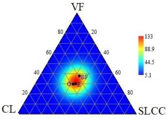 The cellulolytic activity of soils decreased with the depth of the soil in the horizon order O > E > BF, from 53.7 to 69.0 in the O horizon, from 27.3 to 32.7 in the E horizon and from 12.0 to 15.6 in the BF horizon. A marked increase in the cellulolytic activity of soils was noted at the CL site in the upper (O) and underlying (E) horizons, which amounted to 69.0 and 32.7, respectively. The lowest values of the studied indicator (12%) were found in the BF horizon. The ternary graph (Figure 4) shows a greater convergence in the cellulolytic activity of the soils of the upper (O) and mineral (E) horizons (red color), whereas the cellulolytic activity of the alpha-humus (BF) horizon (orange color) has a different location on the graph (Figure 4).