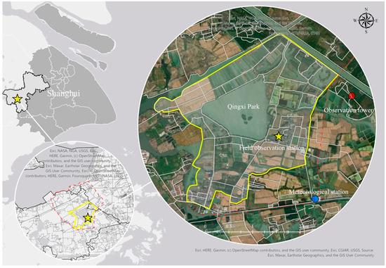 Study area and the locations of the observation station, Meteorological tower and Meteorological station. The yellow line frame is the study area, located in Qingxi Park, Qingpu District, Shanghai, China (121°12′ E, 31°15′ N). The yellow star characterizes the Yangtze River Delta Urban Wetland Ecosystem National Field Scientific Observation and Research Station. The red dot represents the Meteorological tower, while the blue dot represents the Meteorological station. The base map is available at https://services.arcgisonline.com/ArcGIS/rest/services/World_Imagery/MapServer (accessed on 30 April 2023). The shapefiles of the traffic network and administrative area of Shanghai and Qingpu District are from https://www.webmap.cn (accessed on 6 February 2023).